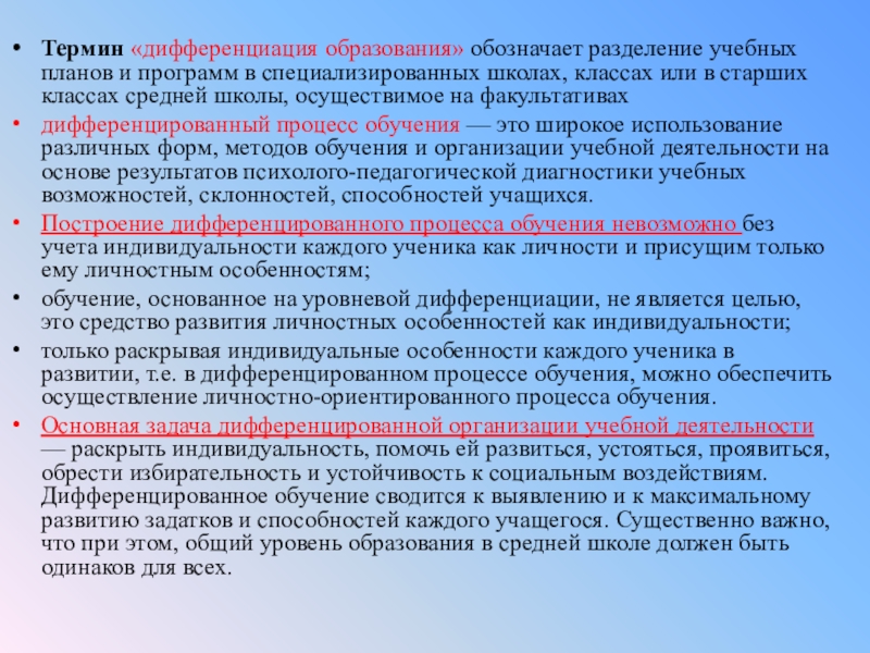 дифференцированный процесс обучения — это широкое использование различных форм, методов обучения и организации учебной деятельности на основе результатов психолого-педагогической диагностики учебных возможностей, склонностей, способностей учащихся.