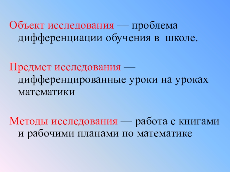 Слайд 3Объект исследования — проблема дифференциации обучения в школе.