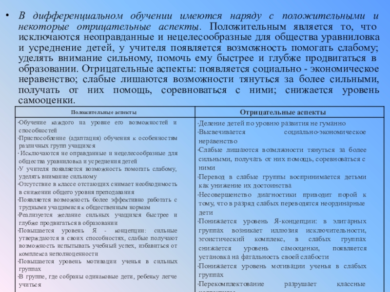 Слайд 10В дифференциальном обучении имеются наряду с положительными и некоторые отрицательные аспекты.