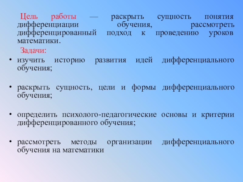 Слайд 2 Цель работы — раскрыть сущность понятия дифференциации обучения, рассмотреть дифференцированный подход