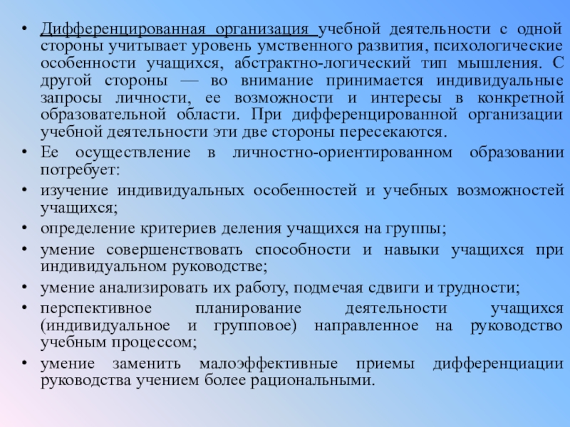 психологические особенности учащихся, абстрактно-логический тип мышления. С другой стороны — во внимание принимается индивидуальные запросы личности, ее возможности и интересы в конкретной образовательной области. При дифференцированной организации учебной деятельности эти две стороны пересекаются.