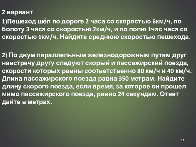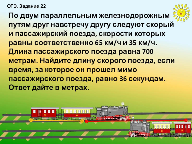 Решение. Относительная скорость поездов равна 65+35(км/ч)=100км/ч =100000/3600(м/с)=1000/36(м/с)