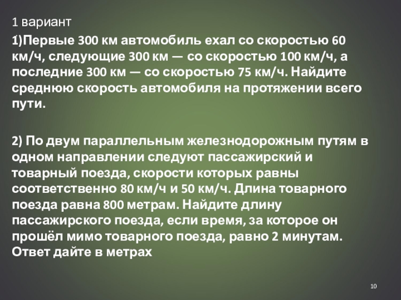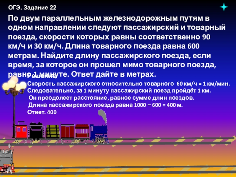 Длина пассажирского поезда равна 1000 − 600 = 400 м. Ответ. 400