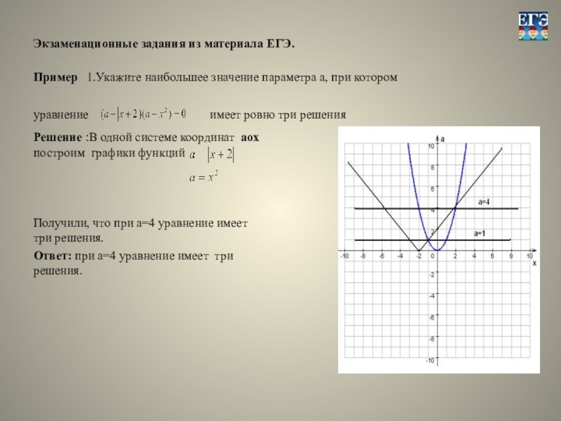 Получили, что при а=4 уравнение имеет три решения.