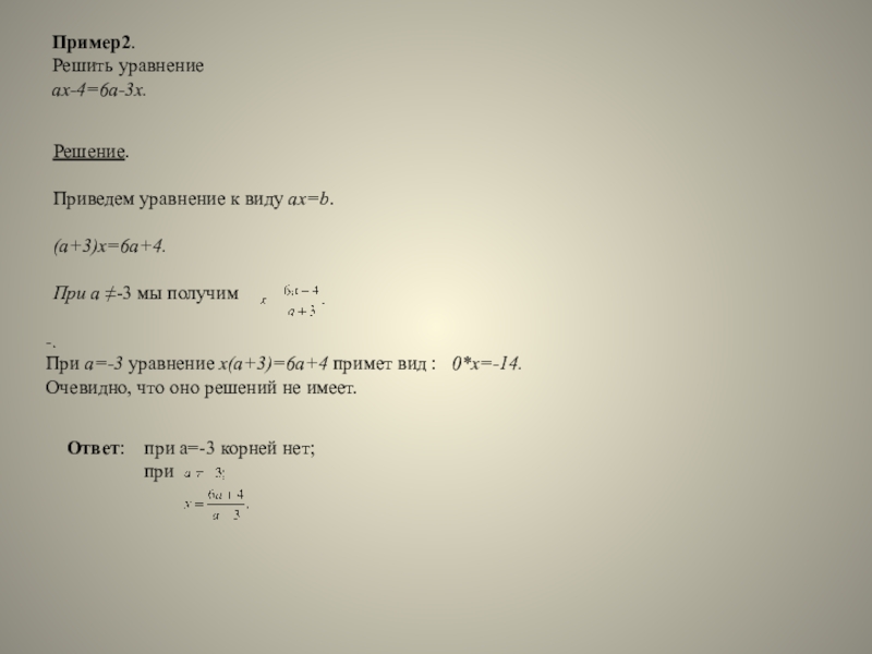При а=-3 уравнение х(а+3)=6а+4 примет вид : 0*х=-14.
