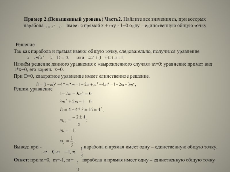 Ответ: при m=0, m=-1, m= парабола и прямая имеет одну – единственную общую точку.
