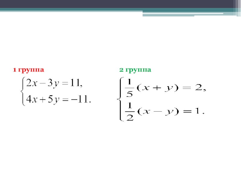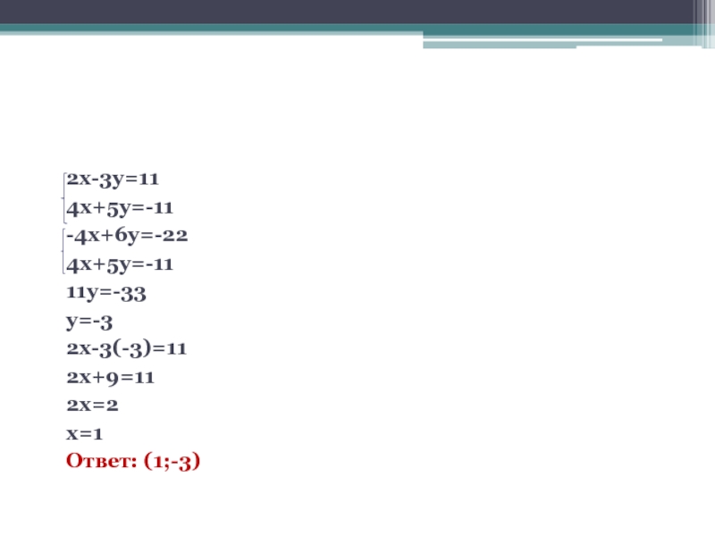 Ответ 1 группа2x-3y=114x+5y=-11-4x+6y=-224x+5y=-1111y=-33y=-32x-3(-3)=112x+9=112x=2x=1Ответ: (1;-3)