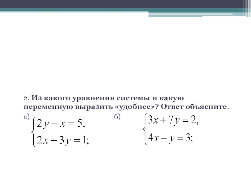2. Из какого уравнения системы и какую переменную выразить «удобнее»? Ответ объясните.а)