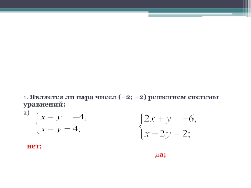 Устная работа1. Является ли пара чисел (–2; –2) решением системы уравнений:а)