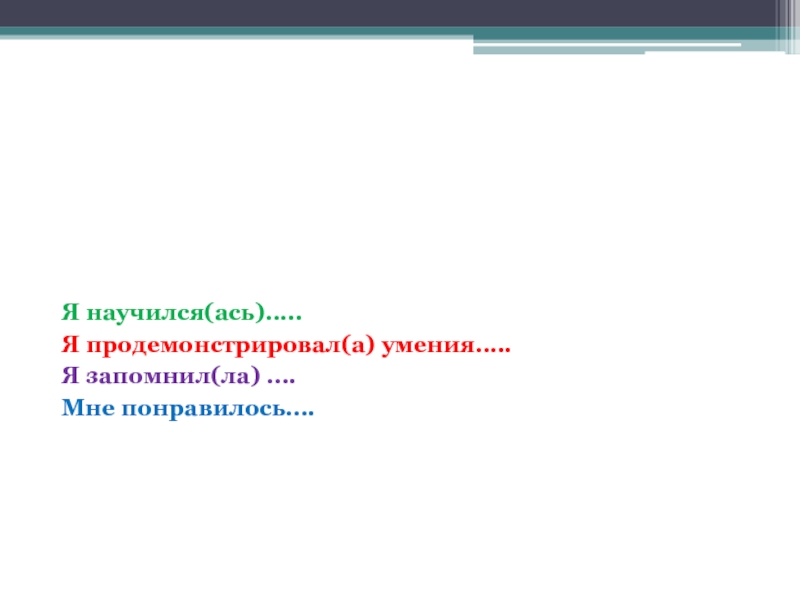 РефлексияЯ научился(ась)…..Я продемонстрировал(а) умения…..Я запомнил(ла) ….Мне понравилось….