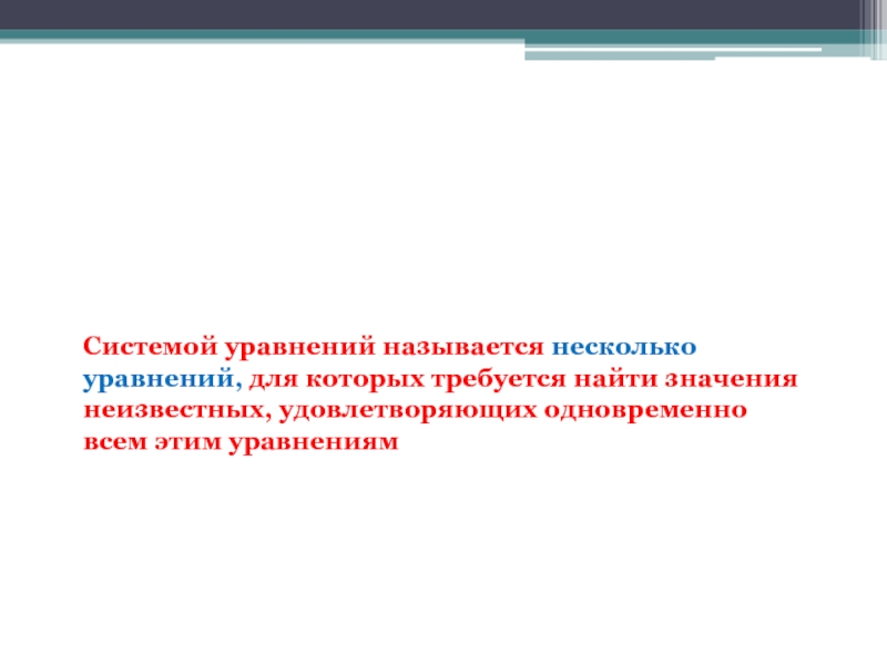 Что называют системой уравнений?  Системой уравнений называется несколько уравнений, для которых требуется найти значения неизвестных, удовлетворяющих
