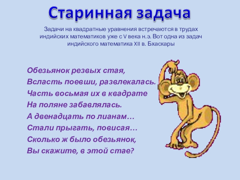 Задачи на квадратные уравнения встречаются в трудах индийских математиков уже с V века н.э. Вот одна из задач индийского математика XII в. Бхаскары