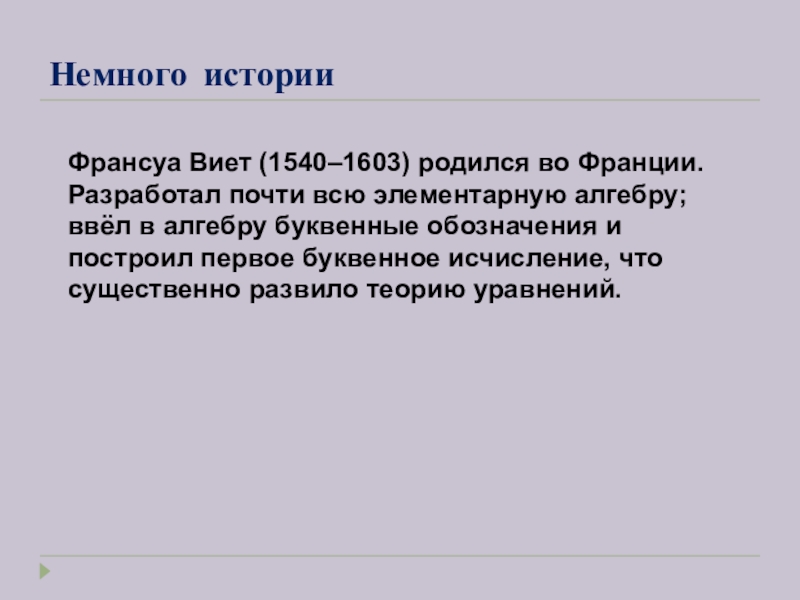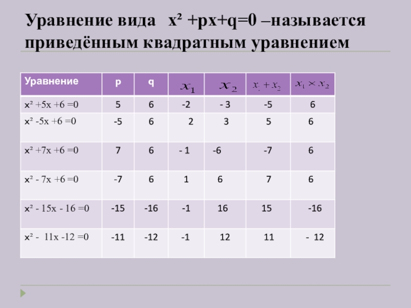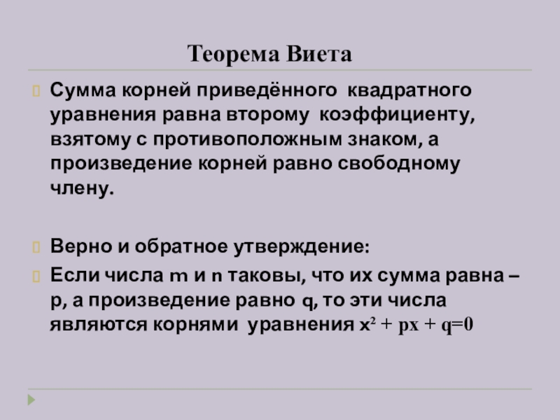 Если числа m и n таковы, что их сумма равна –р, а произведение равно q, то эти числа являются корнями уравнения x² + px + q=0