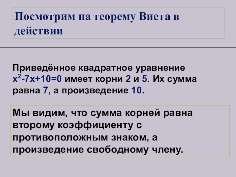 Мы видим, что сумма корней равна второму коэффициенту с противоположным знаком, а произведение свободному члену.