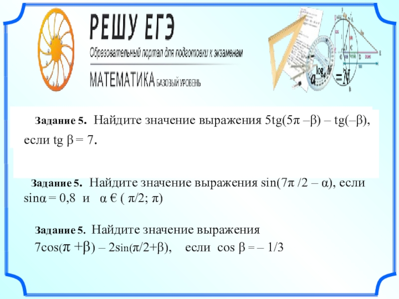 Задание 5. Найдите значение выражения 5tg(5π –β) – tg(–β),