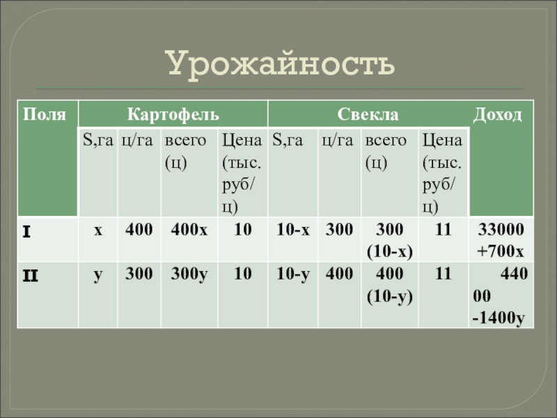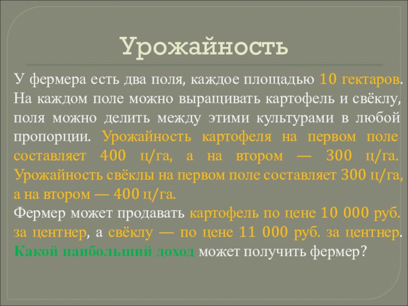 поле можно выращивать картофель и свёклу, поля можно делить между этими культурами в любой пропорции. Урожайность картофеля на первом поле составляет 400 ц/га, а на втором — 300 ц/га. Урожайность свёклы на первом поле составляет 300 ц/га, а на втором — 400 ц/га.