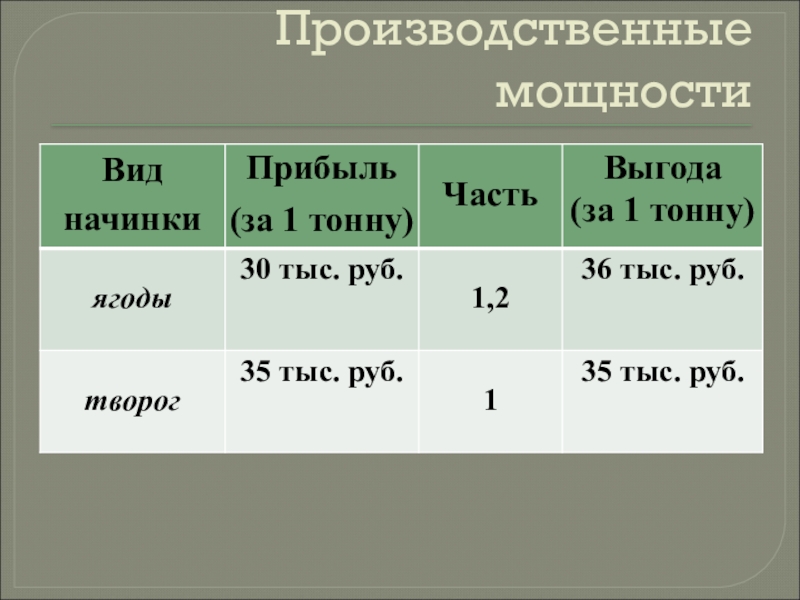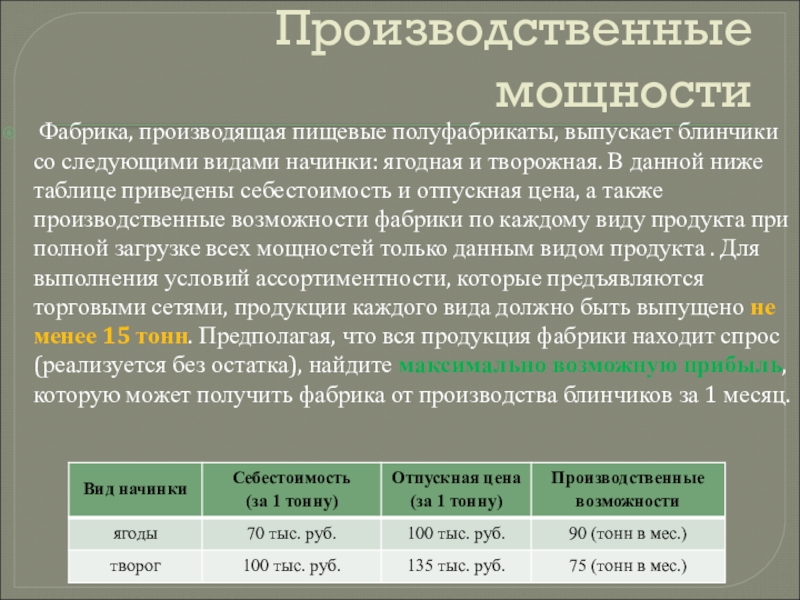 начинки: ягодная и творожная. В данной ниже таблице приведены себестоимость и отпускная цена, а также производственные возможности фабрики по каждому виду продукта при полной загрузке всех мощностей только данным видом продукта . Для выполнения условий ассортиментности, которые предъявляются торговыми сетями, продукции каждого вида должно быть выпущено не менее 15 тонн. Предполагая, что вся продукция фабрики находит спрос (реализуется без остатка), найдите максимально возможную прибыль, которую может получить фабрика от производства блинчиков за 1 месяц.