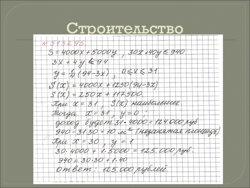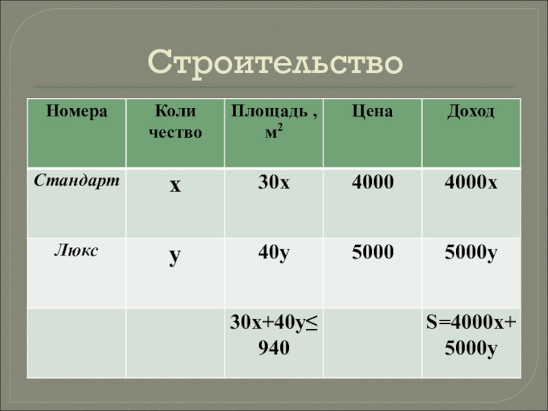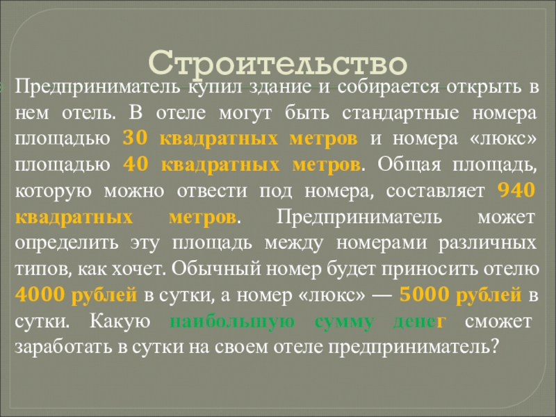 отеле могут быть стандартные номера площадью 30 квадратных метров и номера «люкс» площадью 40 квадратных метров. Общая площадь, которую можно отвести под номера, составляет 940 квадратных метров. Предприниматель может определить эту площадь между номерами различных типов, как хочет. Обычный номер будет приносить отелю 4000 рублей в сутки, а номер «люкс» — 5000 рублей в сутки. Какую наибольшую сумму денег сможет заработать в сутки на своем отеле предприниматель?