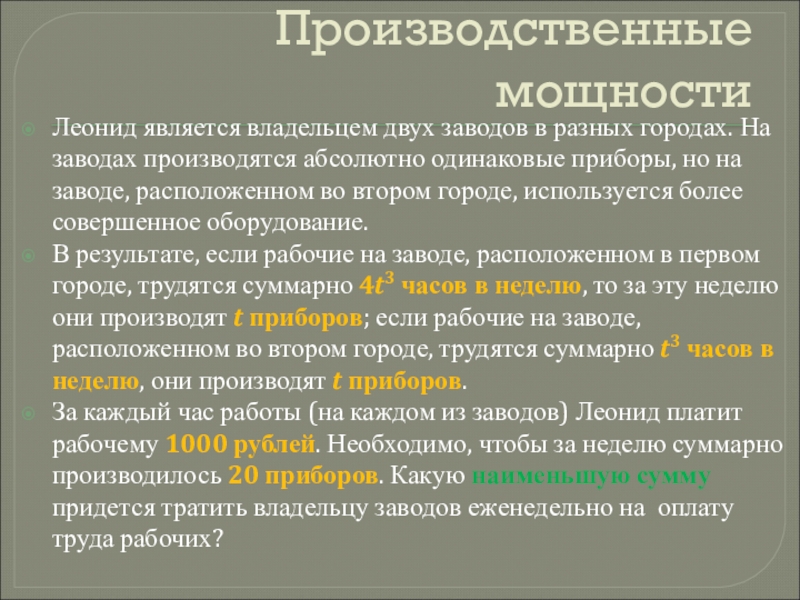 Леонид является владельцем двух заводов в разных городах. На заводах