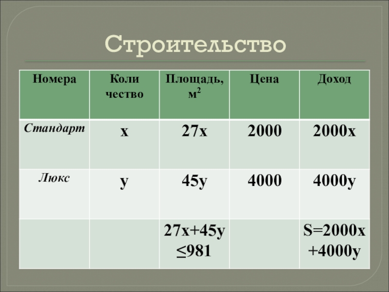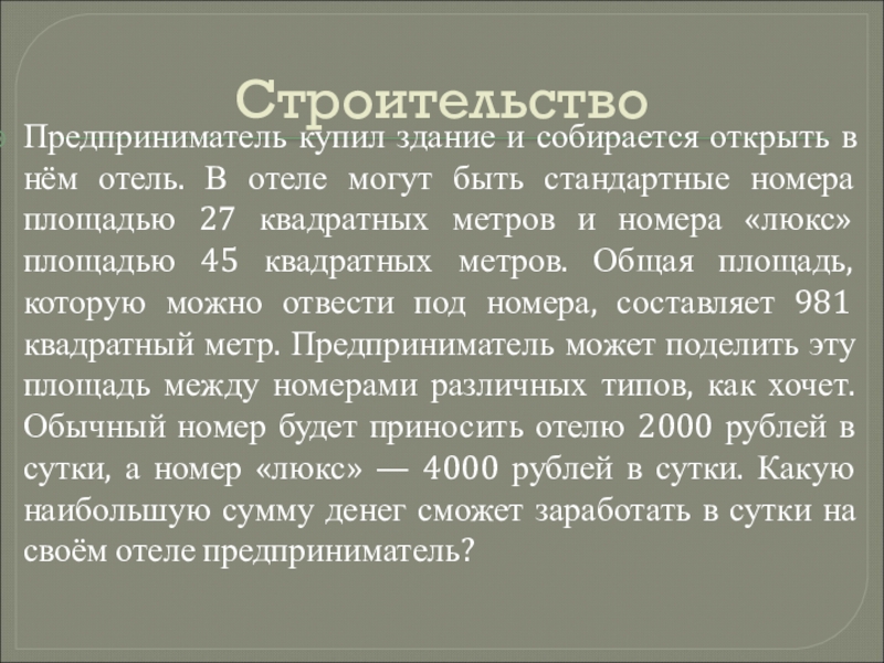 отеле могут быть стандартные номера площадью 27 квадратных метров и номера «люкс» площадью 45 квадратных метров. Общая площадь, которую можно отвести под номера, составляет 981 квадратный метр. Предприниматель может поделить эту площадь между номерами различных типов, как хочет. Обычный номер будет приносить отелю 2000 рублей в сутки, а номер «люкс» — 4000 рублей в сутки. Какую наибольшую сумму денег сможет заработать в сутки на своём отеле предприниматель?