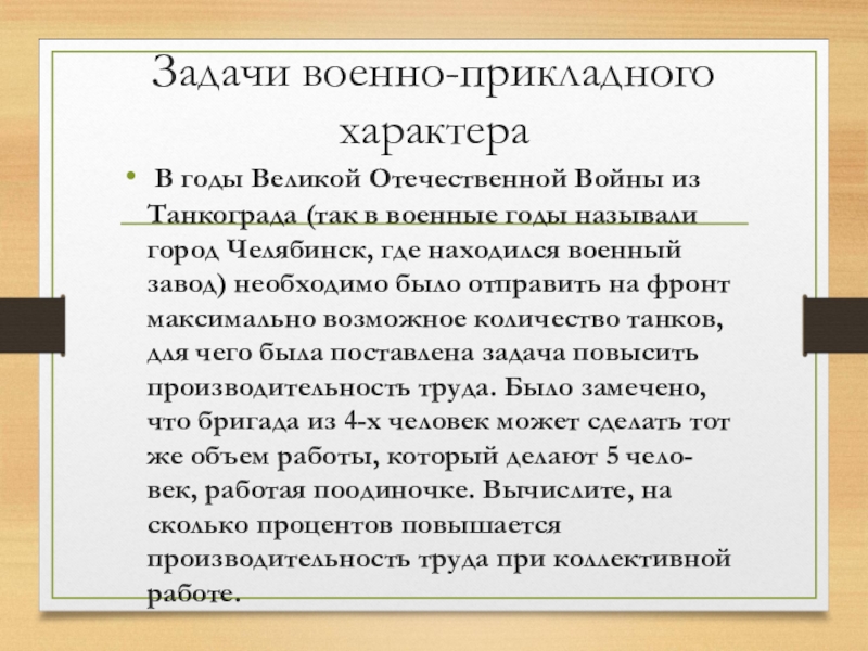 в военные годы называли город Челябинск, где находился военный завод) необходимо было отправить на фронт максимально возможное количество танков, для чего была поставлена задача повысить производительность труда. Было замечено, что бригада из 4-х человек может сделать тот же объем работы, который делают 5 чело- век, работая поодиночке. Вычислите, на сколько процентов повышается производительность труда при коллективной работе.