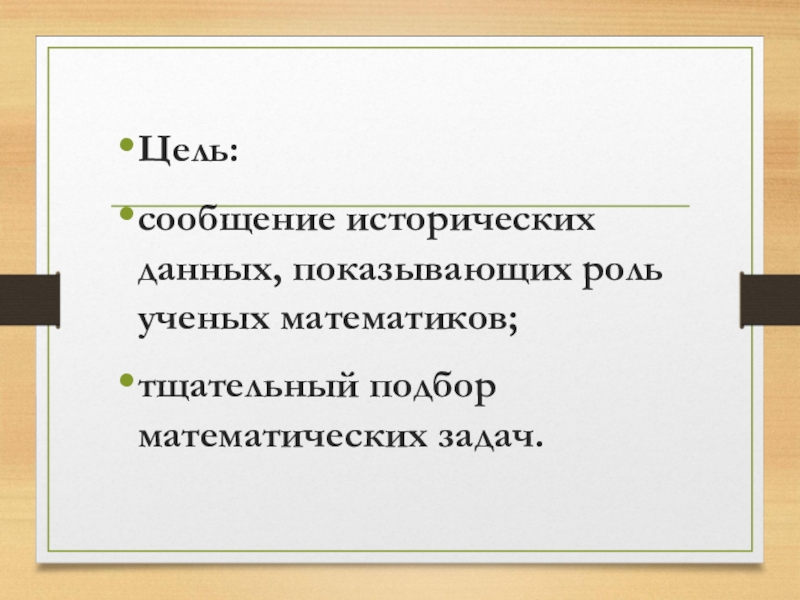 Цель:сообщение исторических данных, показывающих роль ученых математиков;тщательный подбор математических задач.