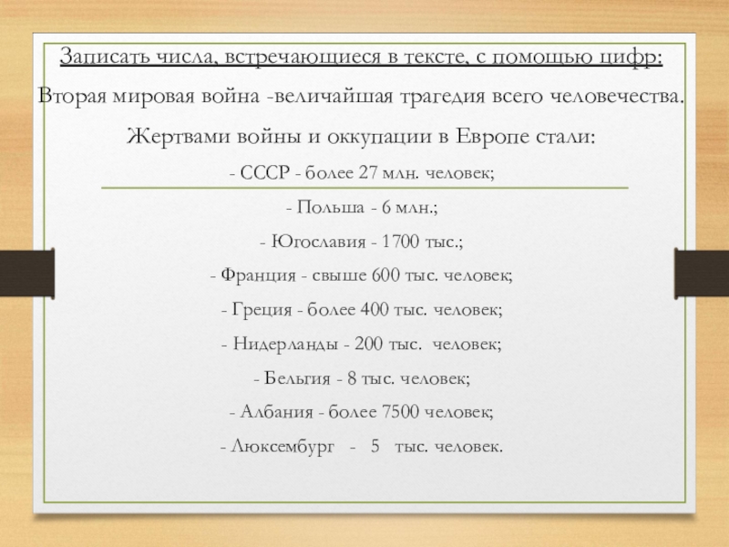 Записать числа, встречающиеся в тексте, с помощью цифр:Вторая мировая война -величайшая трагедия всего человечества. Жертвами войны и