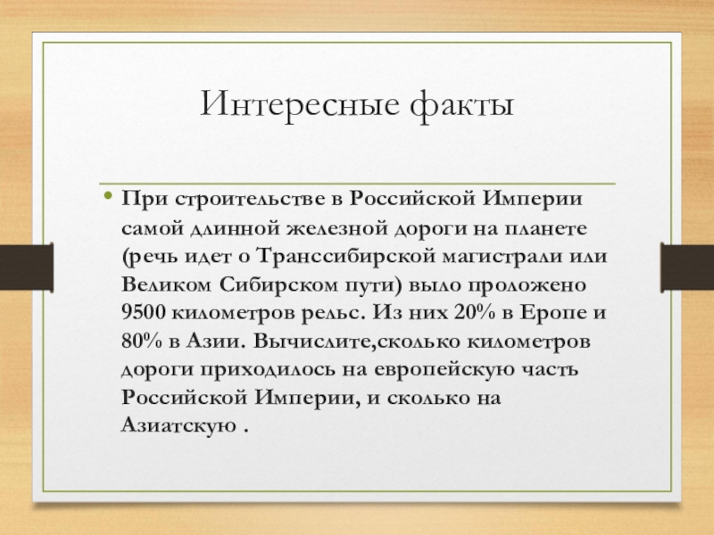 Интересные фактыПри строительстве в Российской Империи самой длинной железной дороги на планете (речь идет о Транссибирской магистрали