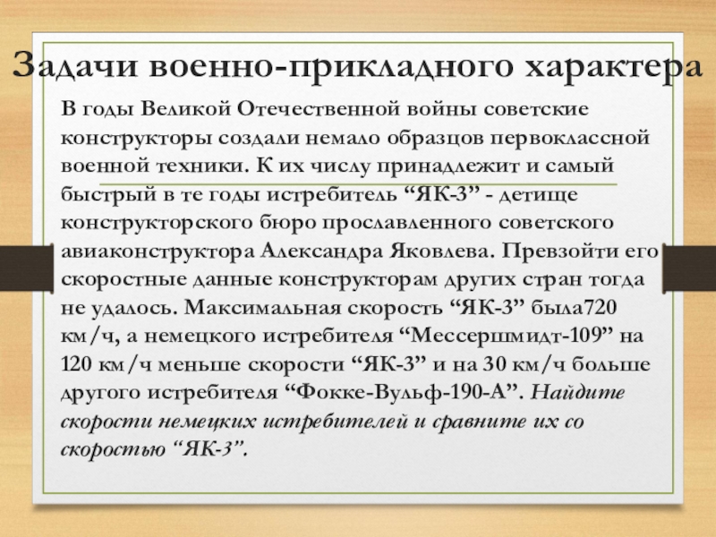 образцов первоклассной военной техники. К их числу принадлежит и самый быстрый в те годы истребитель “ЯК-3” - детище конструкторского бюро прославленного советского авиаконструктора Александра Яковлева. Превзойти его скоростные данные конструкторам других стран тогда не удалось. Максимальная скорость “ЯК-3” была720 км/ч, а немецкого истребителя “Мессершмидт-109” на 120 км/ч меньше скорости “ЯК-3” и на 30 км/ч больше другого истребителя “Фокке-Вульф-190-А”. Найдите скорости немецких истребителей и сравните их со скоростью “ЯК-3”.