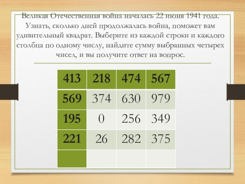 война, поможет вам удивительный квадрат. Выберите из каждой строки и каждого столбца по одному числу, найдите сумму выбранных четырех чисел, и вы получите ответ на вопрос.