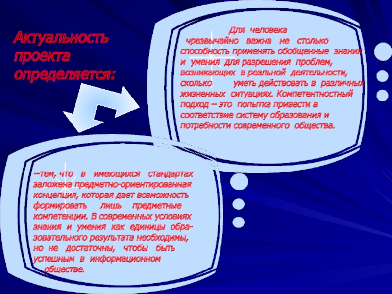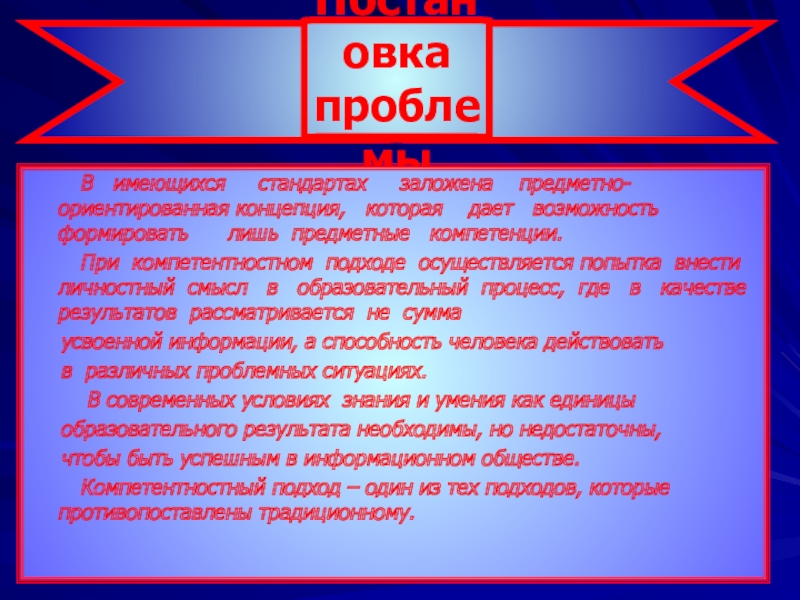 чрезвычайно важна не столько способность применять обобщенные знания и умения для разрешения проблем, возникающих в реальной деятельности, сколько уметь действовать в различных жизненных ситуациях. Компетентностный подход – это попытка привести в соответствие систему образования и потребности современного общества.