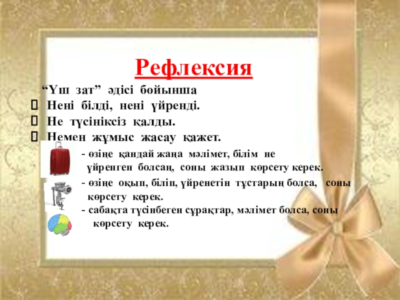 Рефлексия  “Үш зат” әдісі бойыншаНені білді, нені үйренді.Не түсініксіз қалды.Немен жұмыс жасау қажет.