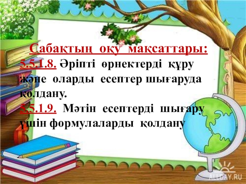 Сабақтың оқу мақсаттары: 5.5.1.8. Әріпті өрнектерді құру және оларды есептер шығаруда қолдану.5.5.1.9. Мәтін есептерді шығару үшін формулаларды қолдану