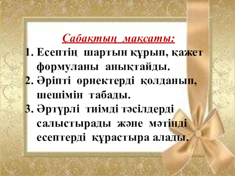 Сабақтың мақсаты:Есептің шартын құрып, қажет формуланы анықтайды.Әріпті өрнектерді қолданып, шешімін табады.Әртүрлі тиімді тәсілдерді салыстырады және мәтінді есептерді