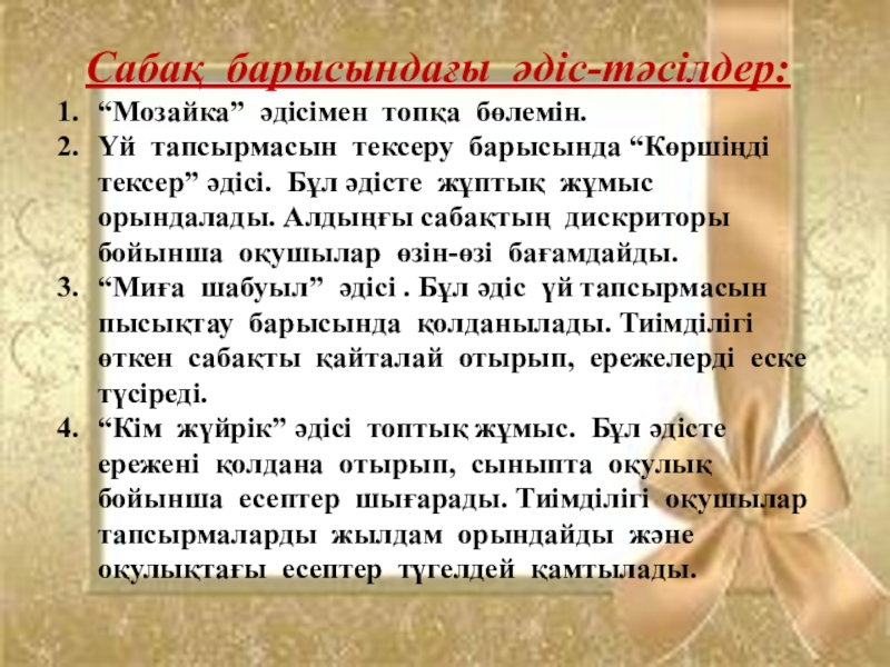Сабақ барысындағы әдіс-тәсілдер:“Мозайка” әдісімен топқа бөлемін.Үй тапсырмасын тексеру барысында “Көршіңді тексер” әдісі. Бұл әдісте жұптық жұмыс орындалады.
