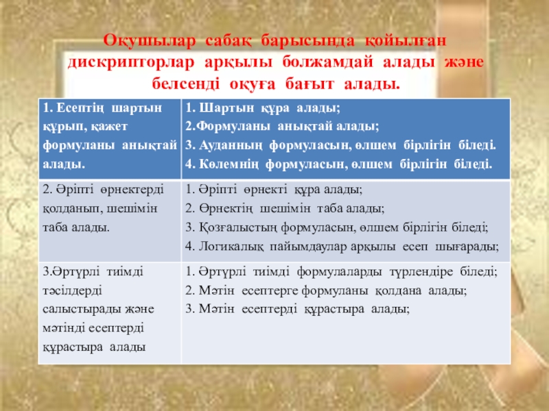 Оқушылар сабақ барысында қойылған дискрипторлар арқылы болжамдай алады және белсенді оқуға бағыт алады.