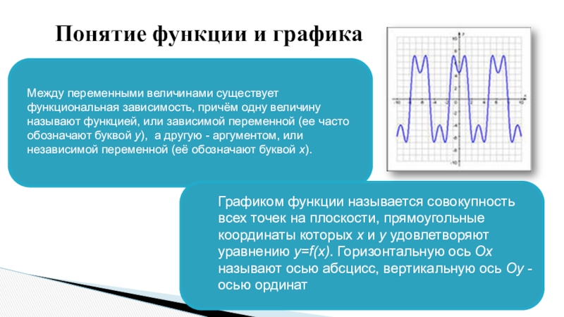 Графиком функции называется совокупность всех точек на плоскости, прямоугольные координаты которых х и у удовлетворяют уравнению y=f(x). Горизонтальную ось Ох называют осью абсцисс, вертикальную ось Оу - осью ординат