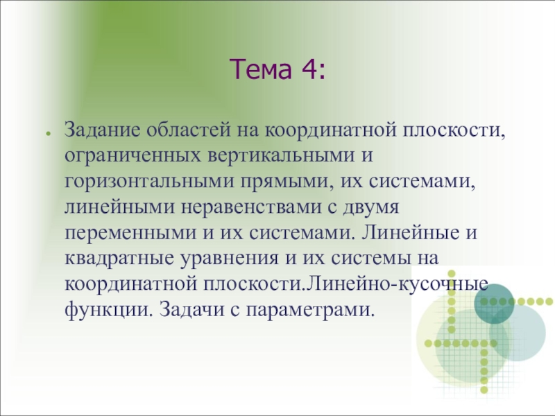 их системами, линейными неравенствами с двумя переменными и их системами. Линейные и квадратные уравнения и их системы на координатной плоскости.Линейно-кусочные функции. Задачи с параметрами.