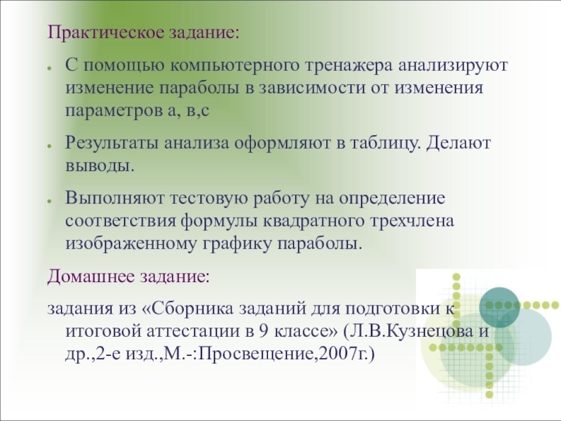 С помощью компьютерного тренажера анализируют изменение параболы в зависимости от