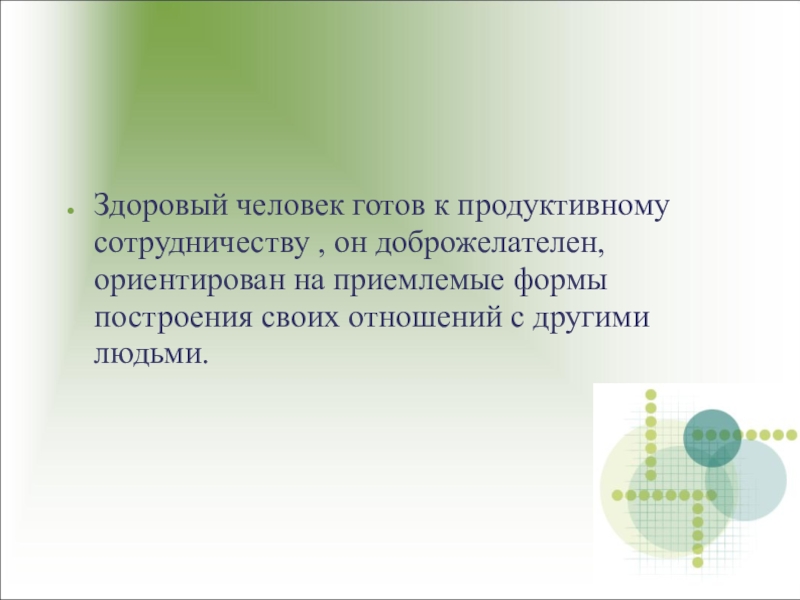 Слайд 3Здоровый человек готов к продуктивному сотрудничеству , он доброжелателен, ориентирован на