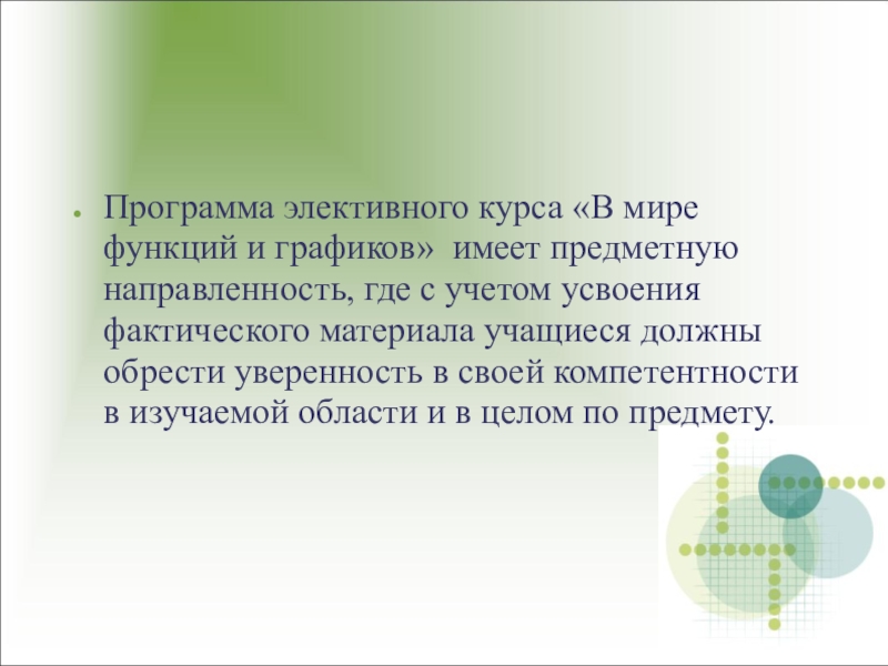 Слайд 4Программа элективного курса «В мире функций и графиков» имеет предметную направленность,