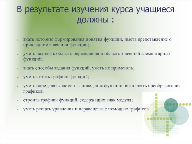 уметь определять элементы поведения функции, выполнять преобразования графиков;
