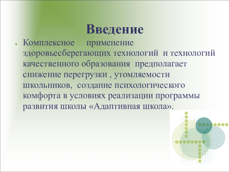 снижение перегрузки , утомляемости школьников, создание психологического комфорта в условиях реализации программы развития школы «Адаптивная школа».