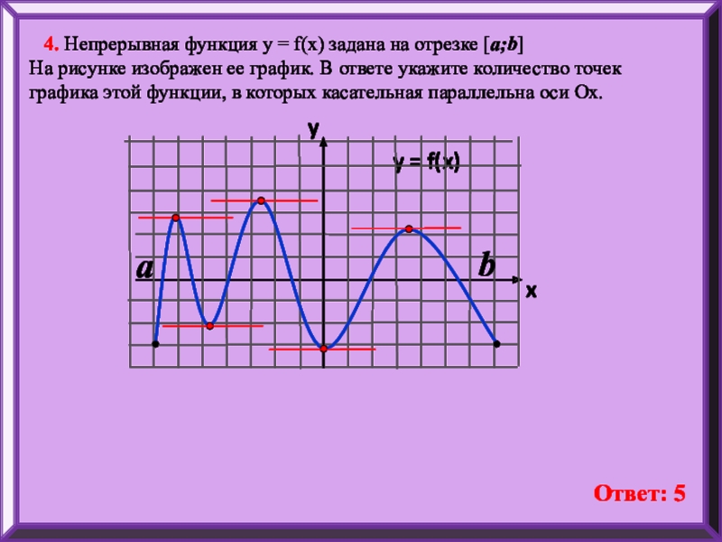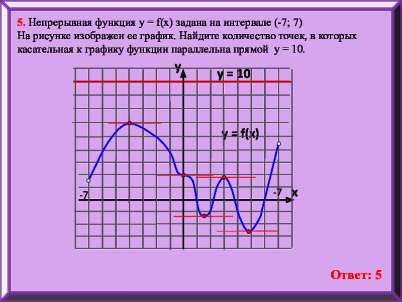 2. На рисунке изображен график функции у = f(x), определенной на интервале (-5; 5). Определите количество целых точек, в которых производная функции отрицательна.
