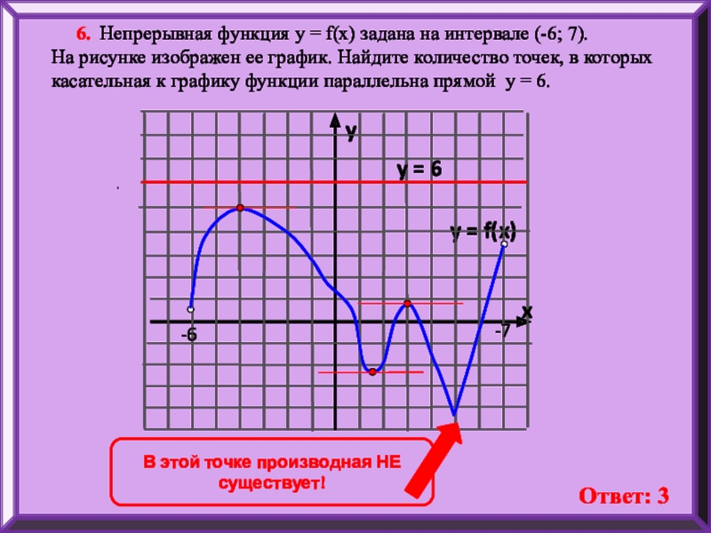 3. На рисунке изображен график функции у = f(x), определенной на интервале (-6; 8). Определите количество целых точек, в которых производная функции отрицательна.