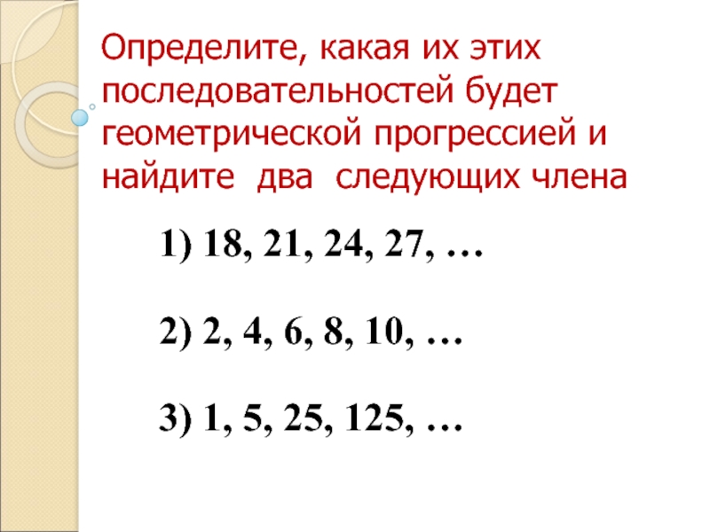 Определите, какая их этих последовательностей будет геометрической прогрессией и найдите два следующих члена