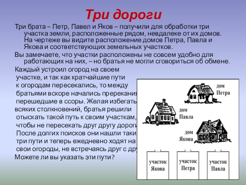 обработки три участка земли, расположенные рядом, невдалеке от их домов. На чертеже вы видите расположение домов Петра, Павла и Якова и соответствующих земельных участков.