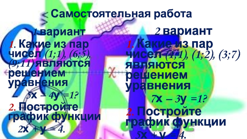 1. Какие из пар чисел (1;1), (1;2), (3;7) являются решением уравнения
