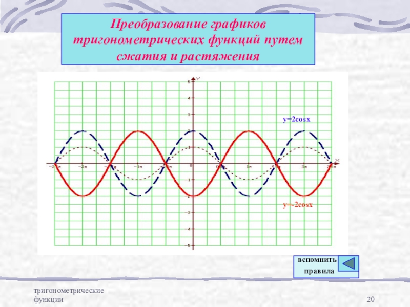 тригонометрические функцииПреобразование графиков тригонометрических функций путем сжатия и растяженияy=2cosxy=-2cosxвспомнить правила