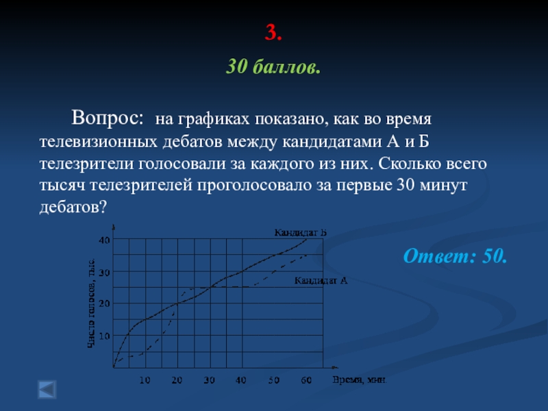 во время телевизионных дебатов между кандидатами А и Б телезрители голосовали за каждого из них. Сколько всего тысяч телезрителей проголосовало за первые 30 минут дебатов?